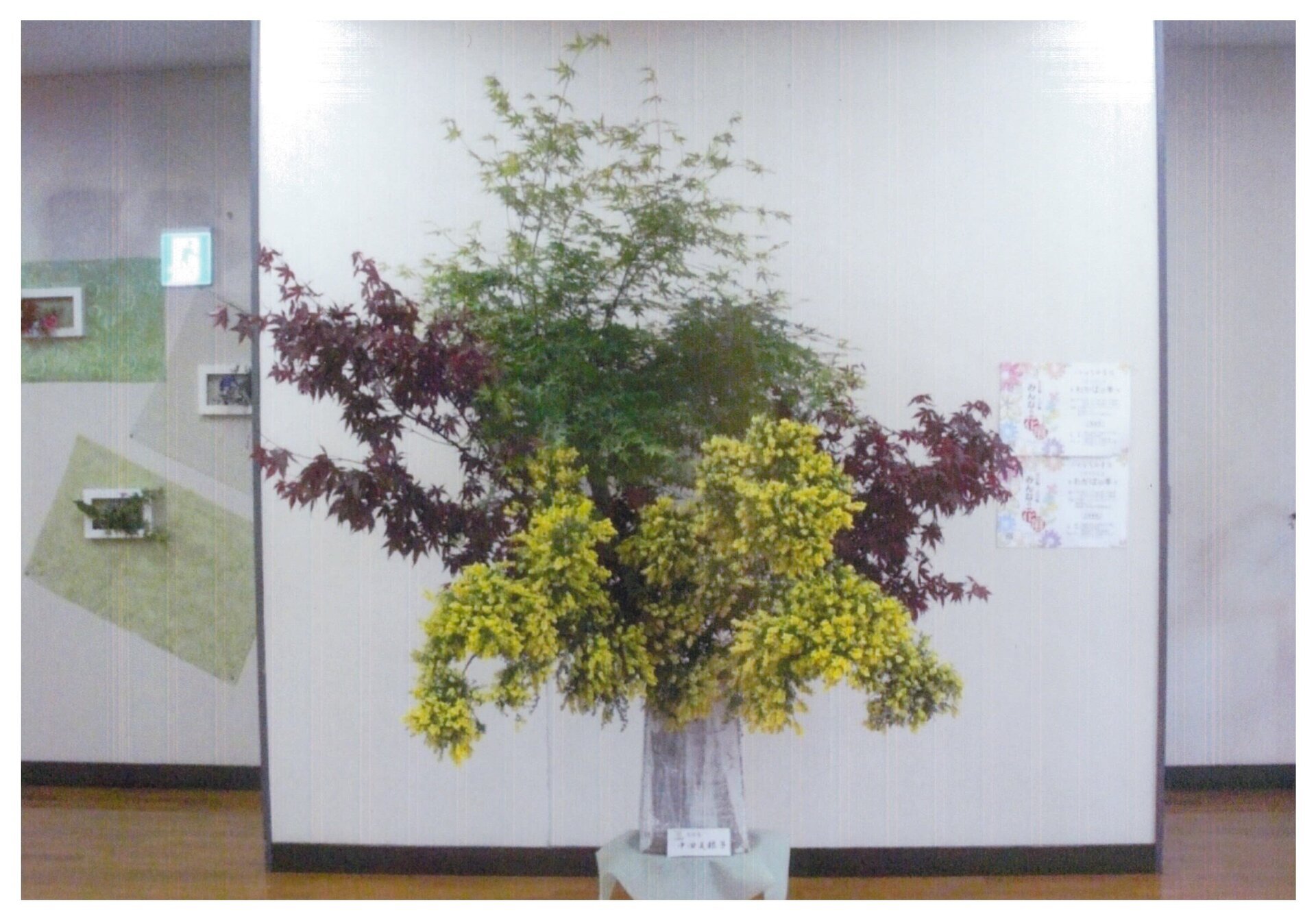 わかばの季節ならではの板宿楓や紅葉、大でまり、花菖蒲、つわぶきなどの花材を用いて、持参したガラス花器にそれぞれが自由に楽しくいけ、アイアン台に展示するまでを学びました。