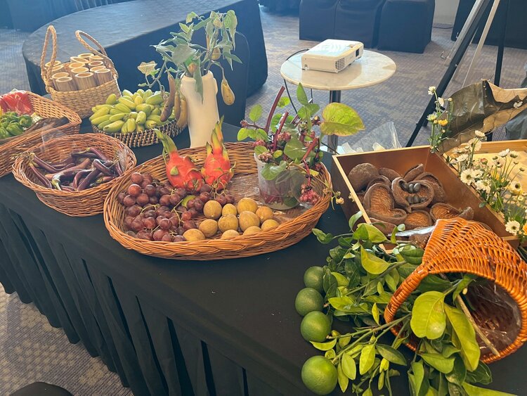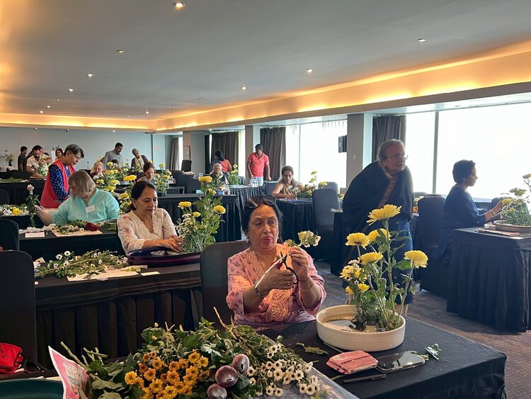 日本より輸出予定の花材が配送都合で届かないトラブルはありましたが、現地花材や文化を活かした盛物や自由表現などの代替講座が好評で、安堵しております。