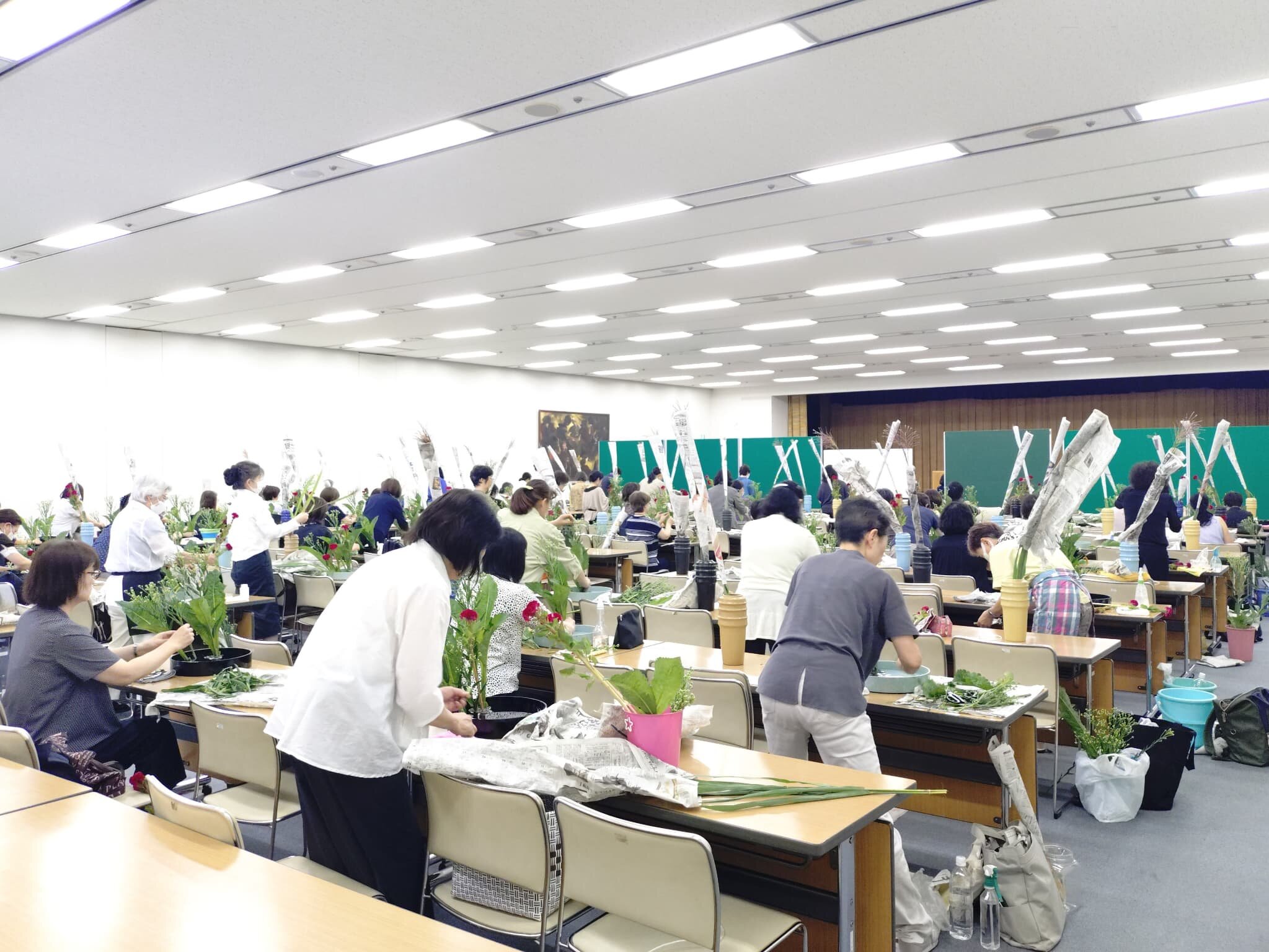 研修士研修会1限目は写景様式で燕子花・河骨・太藺の秋の燕子花の三種いけ2限目は瓶花で立ち透かし籠にななかまど、女郎花、竜胆、尾花、吾亦紅をいけました。会場には一足先に秋の空気が流れており、地区別の合間に見学する方もたくさんいらっしゃいました。「秋の燕子花や立ち透かし籠の多種挿しは触れる機会が少ないので、今回いけられてよかった。」といった声がありました。