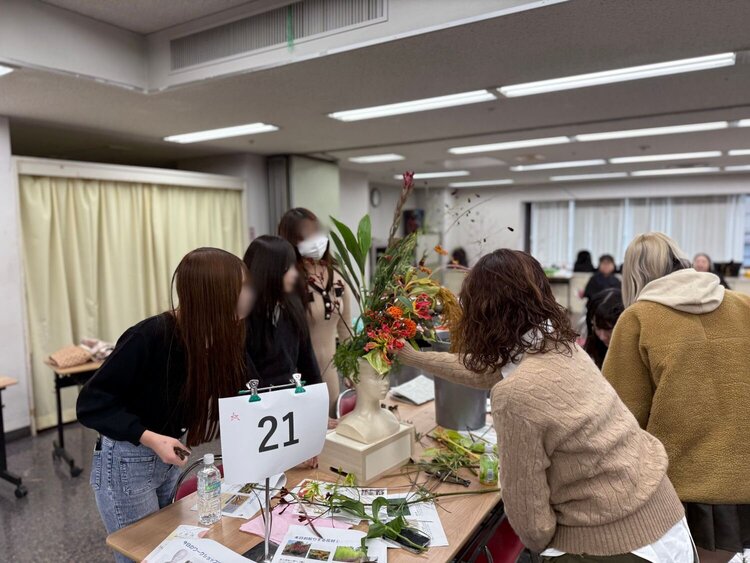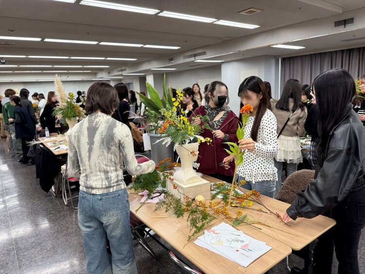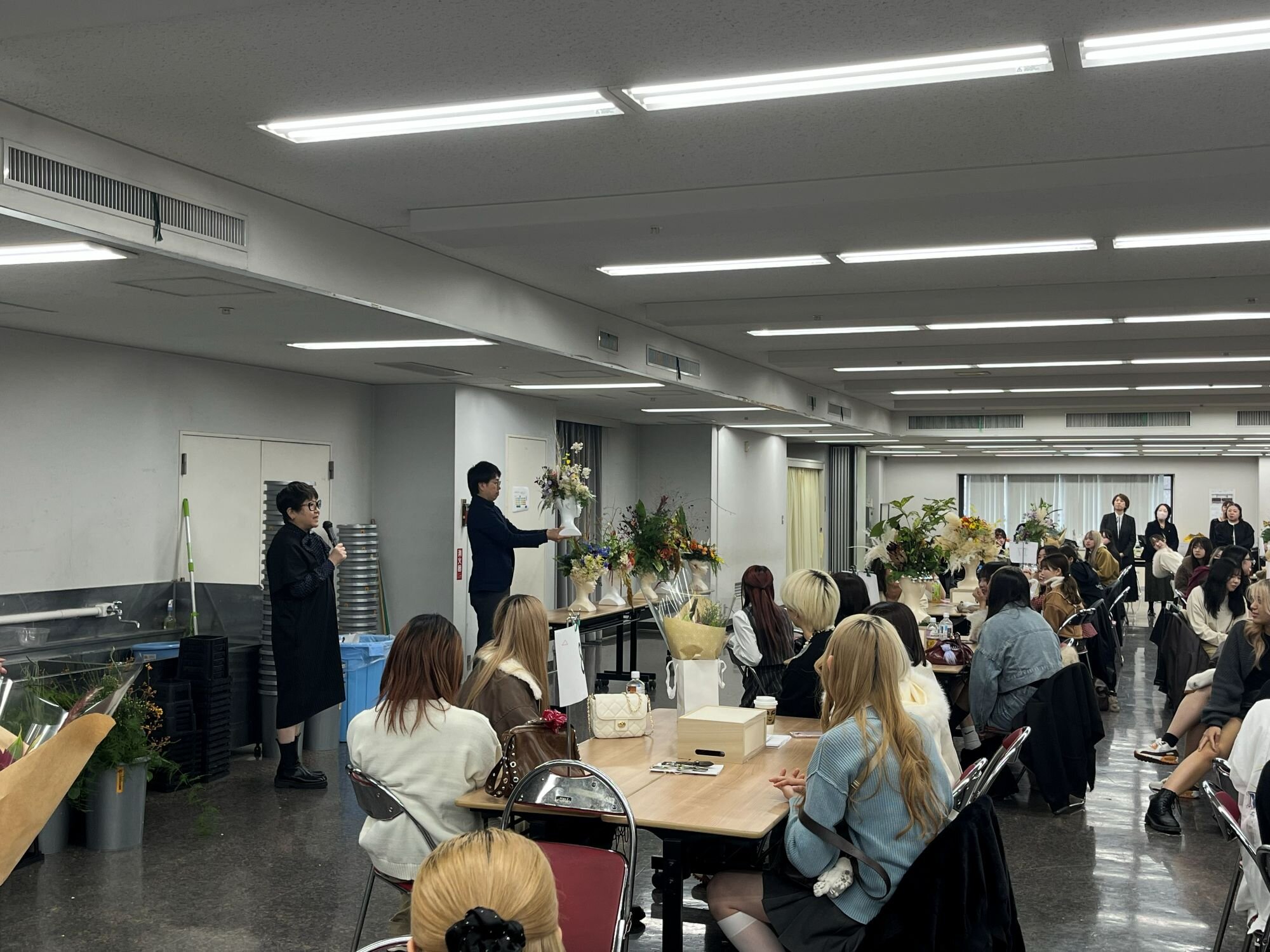 学生の皆さんは、普段から“美”と向き合っているだけあり、花材のバランスや色の重なり方、空間の取り方などに非常に高い感性を発揮されていました。