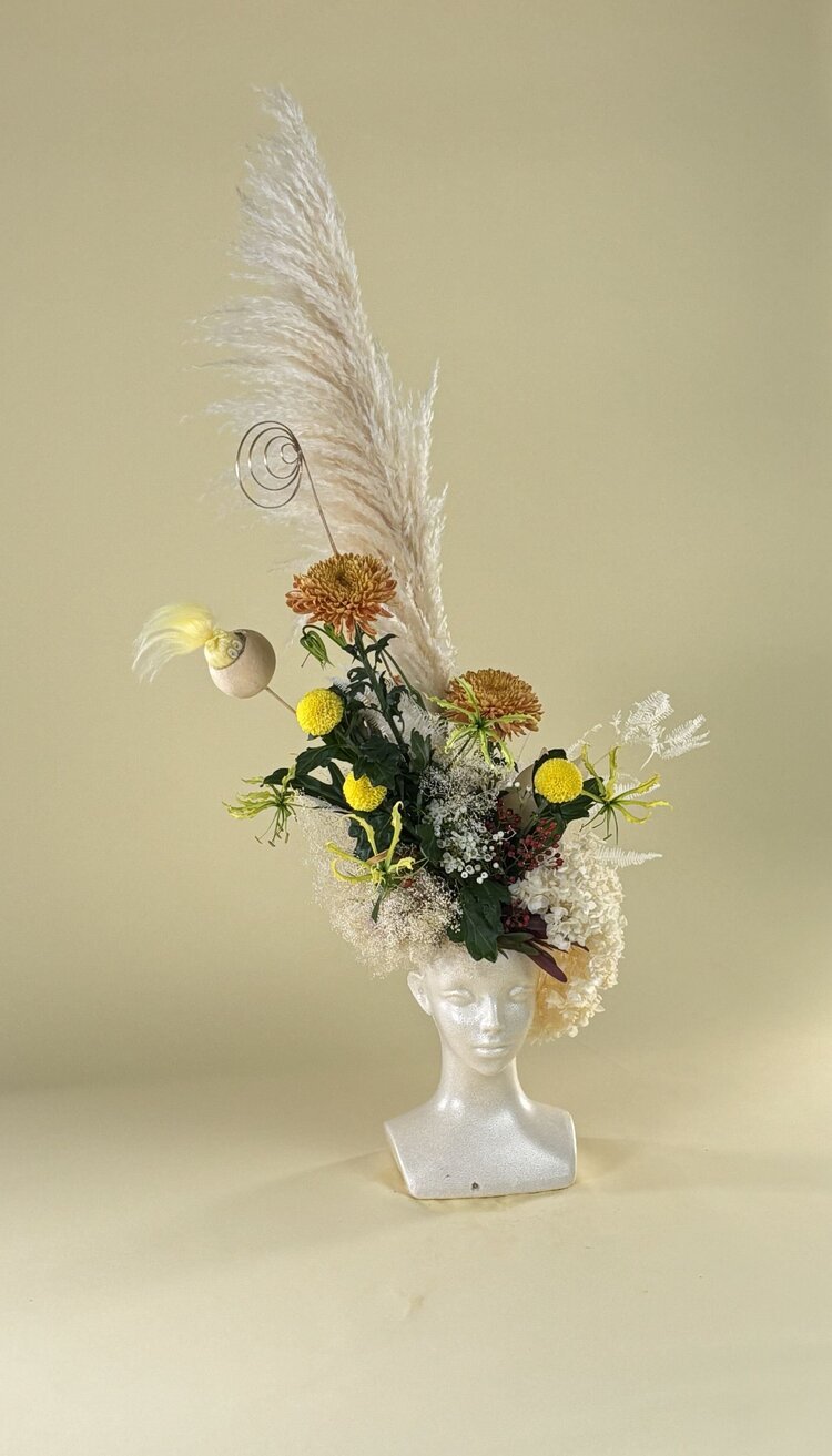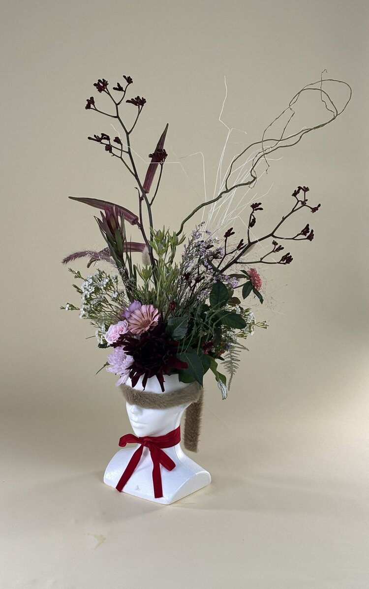 美容を学ぶ学生さんならではの感性を生かし、「ヘアアレンジ風のいけばな」に挑戦していただく今回のワークショップでは、頭部マネキンにオアシスを入れて花をいけるという、ユニークで創造的な試みを行いました。