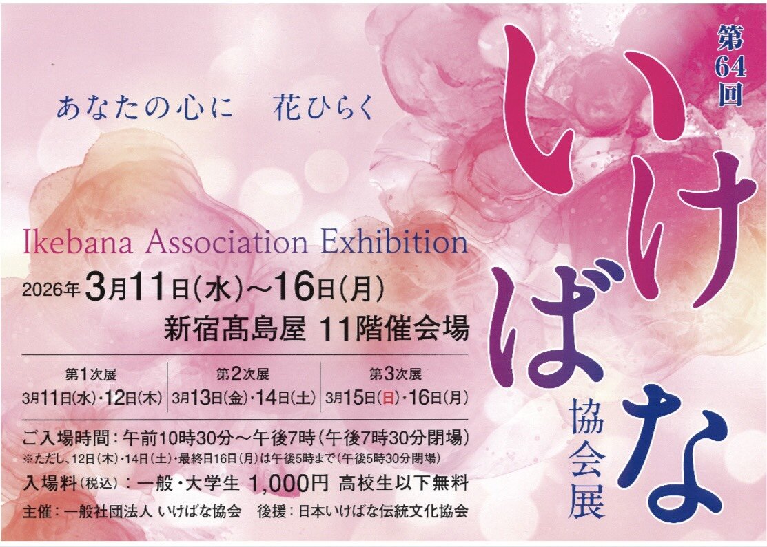 第64回いけばな協会展に家元が出瓶いたします 2026.01.15 イベント お知らせ シェア Tweet 第64回いけばな協会展に家元の作品が展示されます日程 2026年3月11日(水)~ 16日(月) 会場 新宿髙島屋 11階催事場入場時間 10:30~19:00(19:00閉場)※12日(木)、14日(土)、16日(月)は17:00まで(17:30閉場)入場料(税込) 一般・大学生:1,000円 高校生以下:無料ぜひ足をお運びください